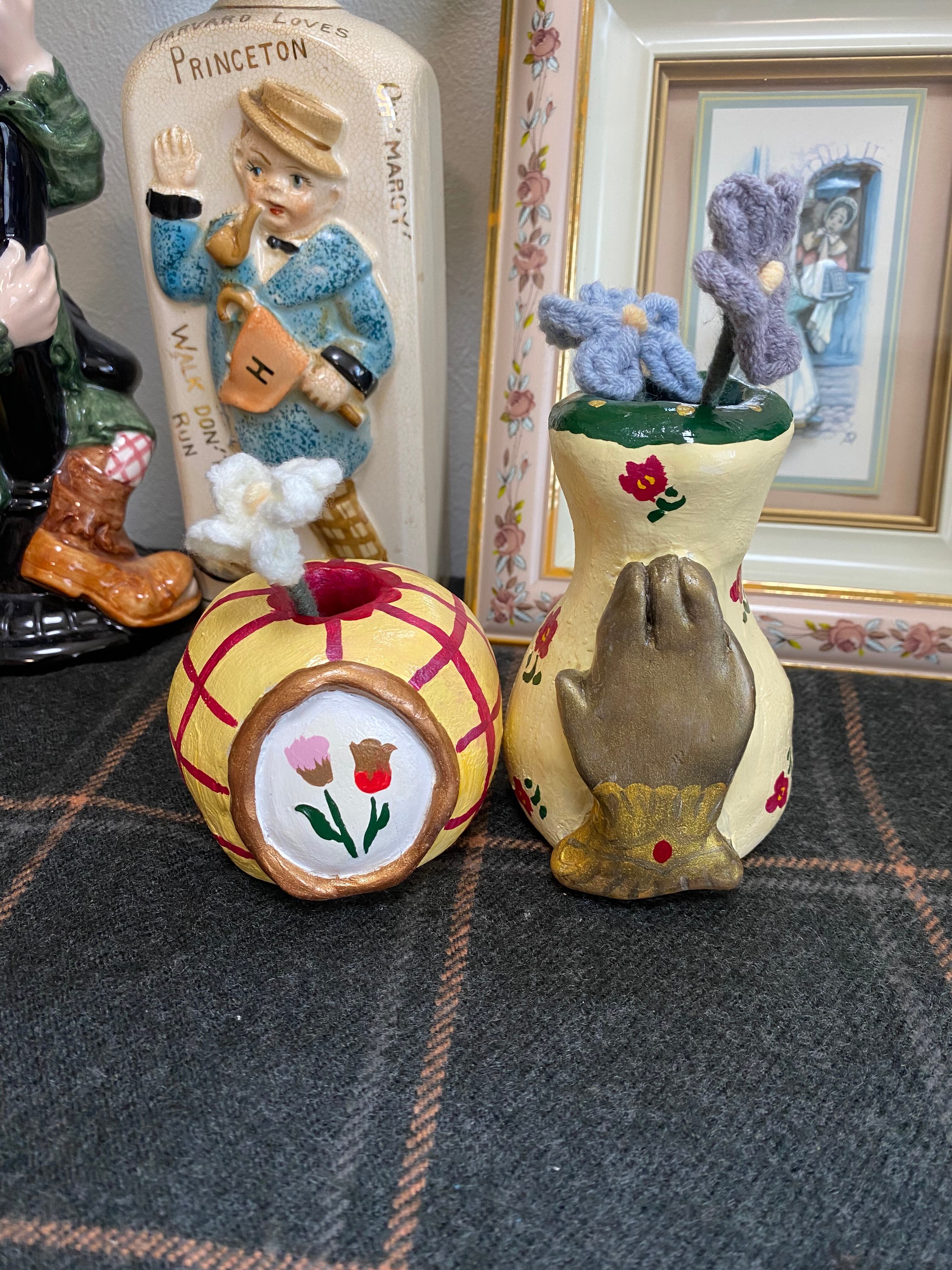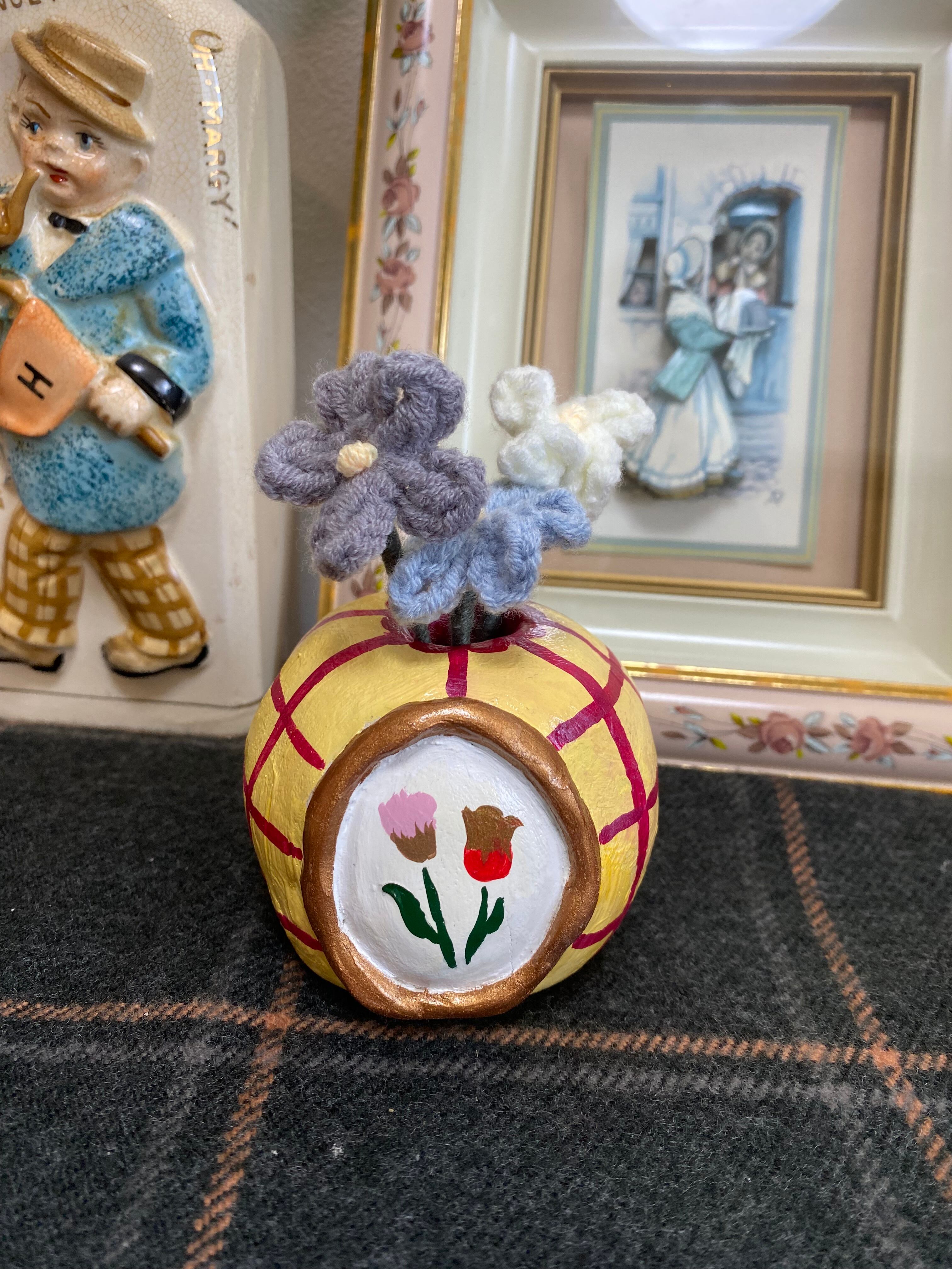 黄色と赤のチェック模様の陶器製花瓶
